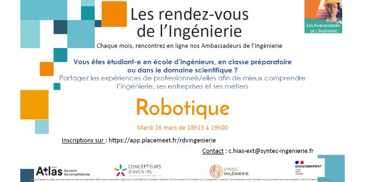 Les rendez-vous de l’ingénierie : chaque mois, la rencontre en ligne entre Ambassadeurs de l’Ingénierie et étudiantsAmbassadeurs de l’Ingénierie : partagez votre expérience et vos projetsEtudiants : échangez avec les professionnelles et professionnels de l'ingénierie et découvrez-en plus sur leurs métiersLe prochain rendez-vous :16 mars 2021, 18:15 → 16 mars 2021, 19:00Les rendez vous de l’IngénieriePour s'inscrire --> https://app.placemeet.fr/rdvingenierie Pour en savoir plus et découvrir la programmation 2021, rendez-vous sur https://app.placemeet.fr/rdvingenieriePlus d’informations : Clément Hias / c.hias-ext@syntec-ingenierie.fr